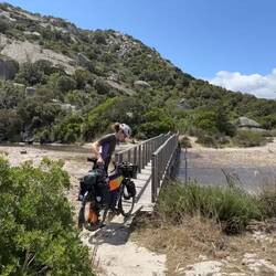 Los geht es ganz gemütlich, mit leichtem auf und ab, zum Strand von Santa Giulia. Wir kämpfen uns durch die Menschenmassen zum Strand. Der einzige Weg, um die heutige Route nicht vollständig auf der viel befahrenen Küstenbundesstraße zu verbringen, führt uns zu erst ein Stück über den Strand (schiebender Weise, vorbei an den verwirrten Badegästen). Wir nehmen den ersten Ausweg zurück auf den übervollen Parkplatz und suchen uns einen Weg zum südlichen Ende des Strandes. Dort soll eine Fußgängerbrücke sein, die uns über den schmalen Meerstreifen führt, der die Bucht von Santa Giulia mit der daneben liegenden Lagune verbindet. Wir schlängeln uns durch eine Hotelanlage und sind froh dass uns der Zugang nicht verwehrt wird. Wir erreichen schließlich den Steg und sind fast schon positiv überrascht dass sich das Ganze nicht zu einem Komoot Spezial entwickelt hat. Aber was nicht ist, kann ja noch werden.