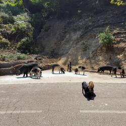 Dann geht’s gaaaanz lang nach unten. Bäume werden wieder mehr und wir fahren an allerlei Getier vorbei. Highlight für mich sind die vielen freilaufenden Schweine die wir endlich sehen! Auch dafür hat sich der gestrige spontane Schwenk in die Hügel gelohnt.