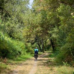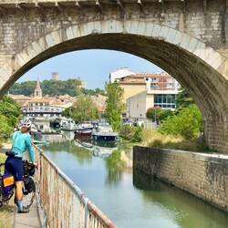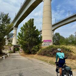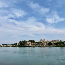 Von Arles aus geht es nun die Rhône hinauf. Wir können uns hier ziemlich auf die französischen Radwege verlassen. In diesem Fall folgen wir den Schildern der Via Rhôna. Der Plan ist, heute vorbei an Avignon und bis Orange zu fahren. Zu Beginn läuft alles wie gedacht. Wir folgen den Schildchen und werden so sicher bis nach Avignon geleitet. Dort angekommen ist uns der Verkehr wieder mal zu viel und wir verspüren keine große Lust, die Stadt aus der Nähe zu betrachten. Ein paar Bilder aus der Ferne genügen uns und schon sind wir wieder auf dem Weg. Doch bald sehen wir mit Unbehagen, dass sich in Richtung unseres Zieles eine dunkle Wand zusammensetzt. Wir fahren noch eine Weile weiter, nunmehr die einzigen auf dem sonst so gut gefüllten Radweg. Ein paar vereinzelte Radler kommen uns noch gestresst entgegen. Wir müssen wohl langsam einsehen, dass es auch für uns an der Zeit wird, diese Sache hier abzubrechen. Das wird kein kleiner Sommerregen sondern ein ordentliches Gewitter. Wir drehen um und strampeln vom heraufziehenden Unwetter davon. Die ersten Tropfen im Nacken und den Wind als Vorboten im Rücken eilen wir zur nächsten Stadt und entscheiden mehr oder weniger während der Fahrt, dass es am besten gleich zum Bahnhof gehen soll. Wir kommen nur Sekunden vor dem Niederprasseln der großen Tropfen an und können uns gerade noch so unter das Dach des Radunterstands retten. Hagel und Sturm folgen. Wir harren der Dinge und mit uns immer wieder andere verzweifelte Menschen.