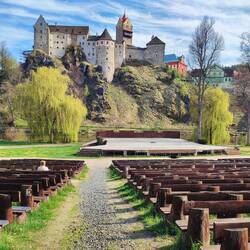 Loket ist eine malerische Kleinstadt in Westböhmen, bekannt für ihre beeindruckende mittelalterliche Burg auf einem Felsen über dem Fluss Eger. Die Altstadt mit ihren engen Gassen und historischenBaca lagi