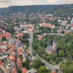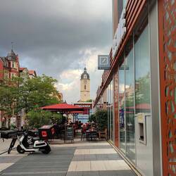 Auf dem JenTower hat man eine super Aussicht auf Jena. Mit dem Aufzug kommt man auf die Aussichtsplattform.