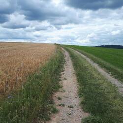 Ich laufe nun abwechselnd über Pfade, Forstwege und Asphalt, tauche in schöne kleine Seitentäler ein und habe immer wieder einen schönen Blick auf die Ortschaften unter mir. In Enscheringen gehe ich ein Mal quer durchs Dorf und darf auf der anderen Talseite einen knackigen Anstieg meistern, der mich zu einer Sonnenuhr mit Rastbank führt. Leider wird immer bewölkter und windiger und Nieselregen setzt ein.Read more