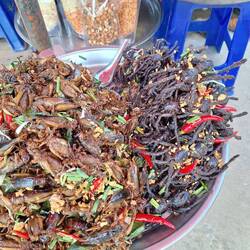 Was wäre ein Asientrip ohne gebratene Vogelspinnen. Auf dem Weg in die Hauptstadt halten wir an einem ganz besonderen Markt.