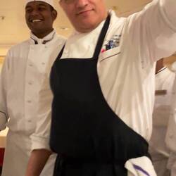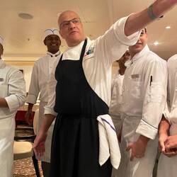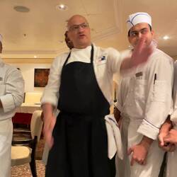 We watched the lovely sunset from our cabin as we were getting ready for the second Around The World (ATW) dinner. All the top officers are there to greet everyone and you walked in with a glass ofOkumaya devam et