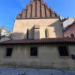 Jews were in this area from the 9th century and although by the 12th century there was already a large Jewish settlement, it was in the walled off ghetto area, attempting to keep Jews separate. In the 13th century the Old-New Synagogue was built, but by the 14th century Jews had been expelled from Morovia and Bohemia (the Czech Republic). Finally the Jews returned and by the 16th century Prague had the largest Jewish population in Europe with many members of the Community in the money lending business. In 1781 the Emperor Josef II took down the walls and ended discrimination against Jews here. Many of the medieval buildings were eventually replaced with modern more affluent buildings but the old Synagogues remained with a Community population of over 55,000 Jews which grew to over 90,000. Sadly, only 10,000 survived the Holocaust with about 7,000 currently living in Prague.
