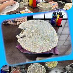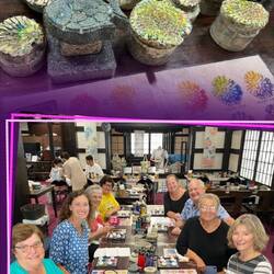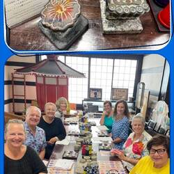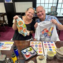 Eight of us visited Shuri Ryusen and learned how to use coral stenciling. Using special dyes and rubbing the ink onto the coral and then onto a tee shirt (Bruce) and a tote bag (Karen). A lot of fun!