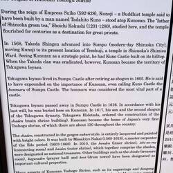 Kunouzan is named after the founder Kuno Tadahito, who established a temple dedicated to Kannon-Bosatsu, during the time of Emperor Suiko (600 A.D.) Kuno-ji Temple was once a complex consisting of over 330 buildings attracting many famous Buddhist monks which ended due to a fire at the base of the mountain around 1225 and there are no remains of the original complex. In 1568 a castle was build atop Kunouzan and was named Kuno-jo Castle and in 1582 Kunouzan and all the surrounding lands within Suruga-no-kuni became possessions of the Tokugawa clan.