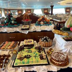 What a great idea to seat us right next to the desserts so I didn’t even have to get up … only reach over for some more sugar. At one point, the Executive Chef reached over and gave me an entire tray of napoleons … how generous and we also polished off the bounty cake, giving Krista and Tim the bow to celebrate their 48th anniversary (the first time … since they had 2 days of celebration because of the IDL).