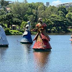 We drove to the historic area of Olinda (pretty view) which was established in 1535 and is a UNESCO Site since 1982. We had to transfer from a bus to small vans to get up the streets to this area and to Carmo Square. Carnival here is world famous (see separate post for costumes and puppets) and we walked in an old market, drank coconut water (from coconuts), watched the frevo (the Brazilian umbrella dance) and enjoyed the colorful neighborhoods. The rooster is the symbol of the city, the name of its main Carnival Street and the representation of the largest Carnival per Guinness Book of Records in 2013. The Crystal Tower in the photo at the end of the main historic area is a 100-foot tower in the Sculpture Park (since 2000) for the 500th anniversary of the arrival of Europeans in Brazil. In the middle of Recife's flag, created in 1973, is an image of a lion, often referred to as the Leão do Norte, or Lion of the North, representing bravery, nobility, royalty, strength, stateliness, and valour.