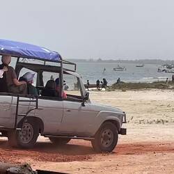 We went on an 4x4 adventure. The 4x4 needed a little maintenance. Well, that is an understatement since it was falling apart everywhere, with bars that were rusted away and could easily become projectile objects, holes in the floor and the engine that stalled numerous times, leaving us abandoned as the other 4x4 left the area. We took an incredibly bumpy ride to the lake and then the famous sand dunes used for the Amsterdam-Dakar and Paris-Dakar races. It is a 6,214 miles, 10 hour per day, 2 week off-road motorcycle and 4x4 endurance test where it is hard to find your way in the rocky and dangerous sand dunes as indicated by the fact that right from the start, of the 182 vehicles and only 74 finished. Although there have been 28 years of races all with different routes, this location in Dakar has always remained part of the race and its finishing point. Note: You may remember that in 1982 Margaret Thatcher’s son did this race and got lost for 6 days in the dessert. This adventure ended with cleaning up and then eating at a Senegalese lunch at a resort, Keur Salim.