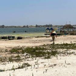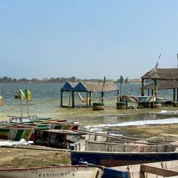 Driving through the Niayes greenbelt we get to the Pink Lake (located 22 miles NE of Dakar) which was not pink today and actually has not been since the heavy rains (its rainy season from May to November) in the last few weeks and the washing away of algae that makes the color. It is normally pink because of the high amount of salt that feeds an aquatic microorganism making it’s 40% salt content, more than even the Dead Sea at 35%. They were selling salt and showed us how everything is very salty. There are 3000 workers that work 7 hours a day to accumulate (for export) 38,000 tons of salt per year from this lake! Due to this high salt content, they need to lather themselves in shea butter to protect their skin from this toxic effects.
