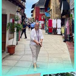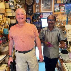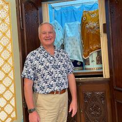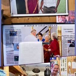 Thaha, who looked after Sarah for more than 30 years (including 10 years before her husband Jacob died), decided to make Sarah’s home into a Jewish Museum that he takes care to preserve including polishing all the relics and still tailoring and chronicling Jewish history here. As he says (yes, we got to meet him when we visited Sarah’s store), “This is an attempt to preserve the Jewish history for the future generations”. Sarah left the store and her house to Thaha to carry on the traditions of the store, a museum and the synagogue. He continues to sell Sarah’s embroidery and also beautiful Judaica in a town with few Jews. Thankfully, visitor come to see the Synagogue and to meet Thaha. Of course, we purchased a beautiful kippah which Thaha explained to me was the design and colors of Kochin. I wore it that Shabbat evening as I led Services on the ship.