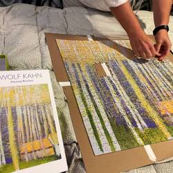 My aunt Jane sent this puzzle to take on our trip. Our cabin is small and surfaces are even smaller…so off to the arts and crafts space to jerry-rig a portable table made from stray cardboard.