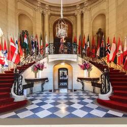 Meridian House is in D.C. and was built by Ambassador Irwin Boyle Laughlin in 1912 designed by renowned architect John Russell Pope (who designed the Jefferson Memorial, the National Gallery of Art and the National Archives). It is filled with his collection of 18th century French drawings and Oriental porcelains and screens. Mr. Laughlin (Ambassador to Greece and Spain among other diplomatic roles in the foreign service) also played an active role in Washington’s artistic and historical communities. The house remained in the Laughlin family until 1958. In 1960, a newly created non-profit organization dedicated to promoting international understanding, which later became Meridian International Center. Meridian House also has a 2-story foyer for grand entrances, Waterford crystal torchieres, and French doors. The dining room features a beautiful Mortlake tapestry, dated to late 17th century and depicts the legendary reception given Alexander the Great by the Greek philosopher Diogene (see. the old photos of meetings and parties here and then how was transformed for a wedding).