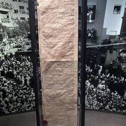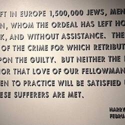 “The Nazi Holocaust, which engulfed millions of Jews in Europe, proved anew the urgency of the reestablishment of the Jewish State, which would solve the problem of Jewish homelessness by opening the gates to all Jews and lifting the Jewish people to equality in the family of nations. Holocaust survivors now landed unhindered in the new state. Many would go on to fight in Israel's War of Independence.”Læs mere