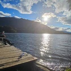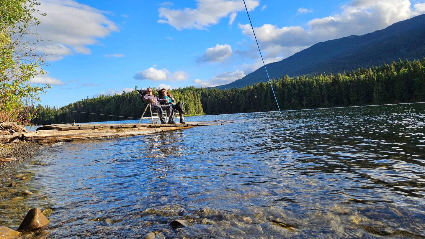 Unterwegs nach Yukon übernachten wir am Kitwancool See mit (sinkendem) Privatsteg. Wir geniessen die Abendsonne und unser Dessert.