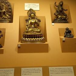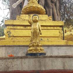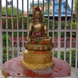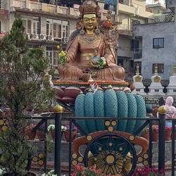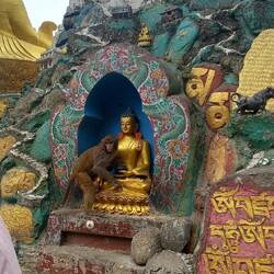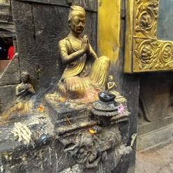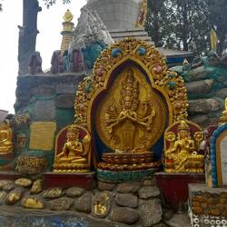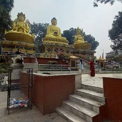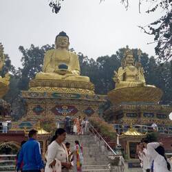 Am Fuße des Swayambhunath stehen Drei beeindruckende goldene Statuen, die als Amitabha/Shakyamuni Buddha, Chenrezig (Avalokiteshvara) und Guru Rinpoche (Padmasambhava) bekannt sind.