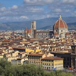 Za kratek čas smo se izgubili v gneči na Piazza della Signoria, kjer stoji mogočna Palazzo Vecchio in replika Michelangelovega Davida, ki ponosno zre v daljavo. Vsak kip, vsaka fontana na tem trgu pripoveduje svojo zgodbo o moči in bogastvu Medičejcev. Imeli smo srečo, da smo bili dovolj zgodaj, da gneča še ni bila pretirana. Še malo naprej smo šli do veličastne katedrale Santa Maria del Fiore, katere kupola, mojstrovina arhitekta Brunelleschija, prevladuje nad mestno panoramo. Občudovala smo marmornato fasado v odtenkih bele, zelene in rožnate barve. Ampak nismo niti pomislili, da bi čakali v nepregledni vrsti, da bi šli na stolp. Tukaj je bila pa gneča in vrste res velika in počasi smo se vračali nazaj. Vmes ena pizza, še en pozen “zajtrk” in nadaljevali smo pot naprej.