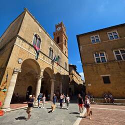 Siena je popolno nasprotje renesančnih Firenc. To je mesto, ki je ohranilo svoj srednjeveški duh, z ozkimi, strmimi ulicami in opečnatimi stavbami. Čeprav smo bili že nekoliko utrujeni, smo se sprehodili še do mogočne sienske katedrale, ki s svojo črno-belo marmornato fasado jemlje dih. Srce mesta je edinstveni trg Piazza del Campo, ki ima obliko školjke in je nagnjen navzdol. Trg je prizorišče slavne konjske dirke Palio, ki poteka dvakrat letno. In danes smo imeli kaj videti. Poln trg, našemljenih ljudi, ki so praznovali zmago na tej dirki 1976 leta. Bilo je glasno, gneča in poslikali smomestno hišo (Palazzo Pubblico) in njen visok stolp (Torre del Mangia), ki je resnično impresiven.