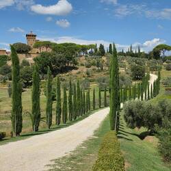 Po kosilu, le nekaj kilometrov izven Pienze, ob cesti, ki vodi proti San Quirico d'Orcia, smo pogledali prizor, ki ga pozna vsak ljubitelj filma. To je znamenita pot, obdana s cipresami, ki vodi do kmetije Terrapille – lokacija, kjer so snemali prizore iz filma Gladiator. Naprej smo tukaj v okolici pofotkali še nekaj ikoničnih toskanskih “razglednic”, na hitro pogledali tudi vroče kopeli v Parco dei Mulini in se po popoldanskem raziskovanju podeželja odpravili še proti Sieni.