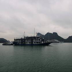 Halong Bay je priznan kot izjemen naravni pojav in je uvrščen na UNESCO-v seznam svetovne dediščine. Obisk tega kraja je potovanje v eno najlepših in najbolj edinstvenih naravnih pokrajin na svetu. Vsak otok ima svojo edinstveno obliko in zgodbo. Tudi tukaj je odklop od vrveža mestnega življenja in se lahko prepustite miru in tišini narave. Zvok valov, šumenje vetra in krik ptic so edini zvoki, ki nas spremljajo. Halong Bay ponuja širok spekter aktivnosti, od vožnje s križarko, kajakaštva, plavanja, raziskovanja jam, plezanja, do sproščanja na plaži in uživanja v morski hrani. Križarjenje po Halong Bayu je najboljši način za doživetje zaliva. Nam so rezervirali luksuzno 5-zvezdično Dora Cruise ladjo, možno je pa tudi iti s tradicionalnimi džonkami. Naša ladja je že bila v zalivu in se prvo peljemo s čolnom cca 45 minut, da nas vkrcajo. Takoj nas čaka odlično kosilo, medtem ko plujemo mimo otokov in občudujemo to nenadkriljivo naravo. Dajo nam ključe od sobe, ki je super. Topla soba, udobne postelje, zraven pa balkon, kopalnica z banjo ob stekleni steni, da ko se kopaš, gledaš vse te lepote okoli tebe. Doživetje je tudi to, da do ladje pridejo prodajalci na čolnih in kar iz balkona kupimo rdeče vino iz Dalata, za cca. 10 EUR. Verjetno bi šlo še za manj, ampak glede da so na ladji vina, za buteljko med 60 EUR do skoraj 200 EUR za francoska vina, je to bila super opcija.