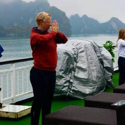 Jutranji žarki sredi zaliva nas prebudijo in ob 7.00 smo že na zajtrku. Pred tem pa še Tai Chi telovadba na vrhu. Pridemo proti koncu, ampak Francozi so pridni, lepo telovadijo. Tu je sicer vse tempirano do minute točno, saj ob 7.45 že moramo biti pripravljeni, ker gremo še na krajši izlet s čolni do ene jame in lagune na tretjem največjem otoku Vietnama, Cat Ba Island. Zapolnijo ti čas tako in v bistvu je bolj smiselno iti res za “dva dni - eno noč”, saj tisti, ki so ostali na ladji, so se danes popeljali z nami nazaj do točke, kjer so nas izkrcali. Ko bodo naložili nove goste, pa bo verjetno spet podobna izkušnja, če ne celo ista ruta. Za tiste, ki so bili dve noči, so danes organizirali sicer drug izlet. Bistvene razlike pa ni.