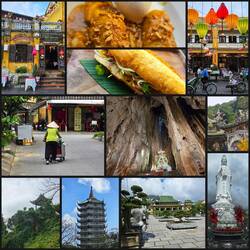 Kosilo spet pri bližnji lokalni družini, podobno a morda celo bolj okusno kot včeraj. In potem še naprej proti Monkey Mountain.Monkey Mountain je polotok Son Tra, lokalno imenovan Monkey Mountain in se veličastno dviguje nad Da Nangom in ponuja osupljive razglede na mesto, obalo in okoliške gore. Ime je dobil po redkih opicah rdečih nog, ki domujejo na polotoku, čeprav jih je danes težje opaziti. Glavna znamenitost Monkey Mountain je Linh Ung Pagoda, ki je dom mogočnega kipa Lady Buddha, ki se dviga na 67 metrov višine. Ta impozantna bela statua, ki gleda na morje, je postala simbol Da Nanga in pomembno romarsko mesto. Poleg duhovnega pomena, Monkey Mountain ponuja tudi čudovite pohodniške poti in razgledne točke, kot je vrh Ban Co, ki ponuja panoramske razglede. Vidimo ogromen kip Lady Buddha, ki je resnično impozanten, sploh ko stojiš pod njim, si res miniatura. Ob vseh bonsai drevesih je tukaj tudi krasna pagoda Lingh Ung in prekrasen pogled na morje, plažo in panoramo Da Nanga. In seveda opice, prosto hodijo, brskajo po smeteh, se nastavljajo in se med seboj igrajo. Kar nekaj jih vidimo, nobena od njih pa ni bila nič agresivna ali, da bi jo zanimala kakšna sončna očala, kot smo že kje drugje v Aziji videli. Mi jih lepo slikamo, one delajo to kar delajo in vsi zadovoljni.