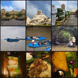 Naslednji del izleta nadaljujemo do Mekong delte. To je regija v južnem Vietnamu, kjer se reka Mekong izliva v morje skozi mrežo rek, kanalov, močvirij in riževih polj. Je bogata in rodovitna regija, znana kot "riževa skleda Vietnama", saj proizvaja velik del vietnamskega riža in sadja. Ob obali delte Mekong se nahajajo mangrove in močvirja, ki so pomembni ekosistemi in nudijo zaščito pred erozijo obale. Enodnevni izlet ne omogoča, da bi videli plavajoče tržnice, ampak se moramo zadovoljiti z “mini” izvedbo. Prvo na ladjo, preko reke do Coconut island, kjer nam pokažejo lokalno kulturo, kako se delajo kokosovi bomboni in še kaj, poskusimo tudi kačje vino. Ker je vodostaj tako nizek, nas s tuk tuki peljejo do tistih najbolj ozkih kanalov, kjer se peljemo z lesenimi čolni. Vmes pa punci hranita ribe, krokodile, pojemo kosilo s klasično ribo, ki so jo enako stregli tudi 18 let nazaj. Nazaj grede še nam pokažejo čebele in dajo za poiskusit med, matični mleček. Jasmina se spet slika s pitonom in za konec še z golf avtkom do enega lokala, kjer nam postrežejo sadje in poslušamo še lokalno glasbo, v živo.