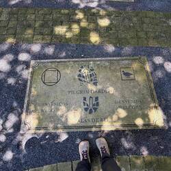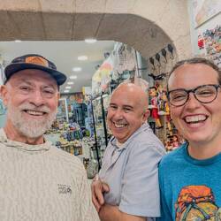 We arrived at A Rua Recordos just as Oscar was opening for the day. The shop isn’t fancy like those closer to the Cathedral; it doesn’t have a flashy sign out front; there doesn’t appear to be any rhyme or reason to the stacks and piles of souvenirs. What you do feel when you walk into the store is the great energy that Oscar has created with his collection and his care for the pilgrims who enter. Within seconds, he had located our patches for us and asked us about our journey. I showed him on my phone the WhatsApp conversation I had had with him several months ago.