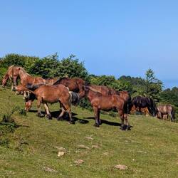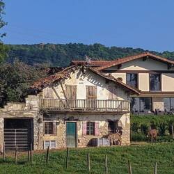 The walk today took us out of the city, through farmland, and over a mountain pass that was full of livestock. One donkey laughed and brayed at us for a good half a minute. We laughed at ourselves today, too. The sun hoodie I am wearing says, “Mauka to Makai,” which in Hawaiian means “from the mountains to the sea,” which is a great theme for these first two weeks. Weatherwise, there was not a cloud in the sky, and while it wasn’t as warm as it is in other parts of Spain, both of us had finished our three liters of water before we reached the town of Pasai Donibane, where we stopped for the day. Most pilgrims push on to San Sebastian, but we had agreed not to rush the beginning and let our bodies adjust to the walk, especially since this route starts out with a gnarly climb. We were glad we did. We were spent when we arrived and grateful for a private room, hot showers, and a nap.