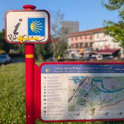 We stopped and took pictures on the bridge at the border and then continued back into Irún. We followed the yellow arrows, which we found on the ground, on posts, and on signs. It was easy to navigate the Camino path through this border town, and that can’t be said for all cities on the Camino.