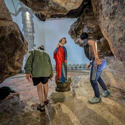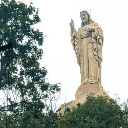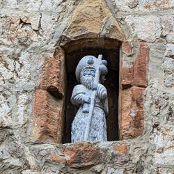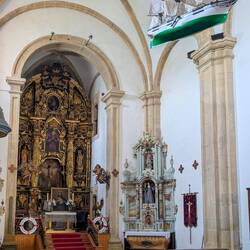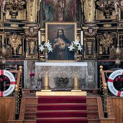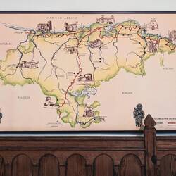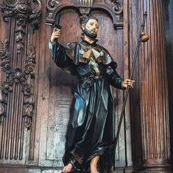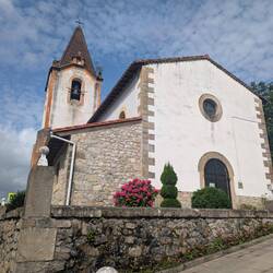 The large Catholic church in Irún was closed as we passed by, as was the Santiago Hermitage, but I was able to take a couple of interesting photos through a window. The Guadalupe Hermitage was open after our first gradual climb, and it was full of interesting art and a crucifix suspended from the center of the ceiling. Later in the day, we entered the Basilica of Cristo de la Bonanza, which had a model ship with a green hull hanging from its ceiling and a couple of life preservers on the altar, which made more sense when we learned that the locals pray for the fishermen’s safe return, as well as boatloads of fish.