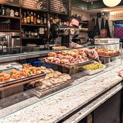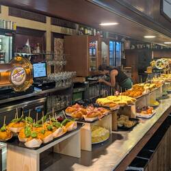 For dinner tonight, we headed out to Old Town, under the Good Shepherd statue on the top of the hill. I introduced Bonnie to Pinchos, the Basque version of Spanish tapas. I had been taught well by my friend Nancy Reynolds when I passed through Pamplona two summers ago when she was also in that city. She encouraged me to invite my friends to come along but was a little surprised when I showed up with 17 of them! It’s easy to make friends on the Camino, especially when you invite them to have Pinchos.