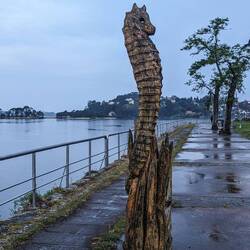 After the forest I weaved in and out of little towns until the Way runs into the Ulla River. Two summers ago we walked the spiritual variant which meant we took a boat up the river to Padron. I recognized where we had disembarked. I recognized the horse that Jamie fed an apple to. I recognized tha albergue where we stayed in Padron.