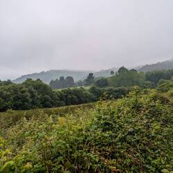 We set our alarm for 5:30 and were on the road by 6:00. We had hoped for a reprieve from the rain but our ponchos stayed on most of the day. I also ran into an issue early on as the bite valve on my hydration bladder was missing, which meant everytime I leaned over I was getting squirted with the Spanish version of Gatorade that I had filled my bladder with. Unfortunately I didn't pack a backup bite valve, so again, I'm not as prepared as I'd like to be.