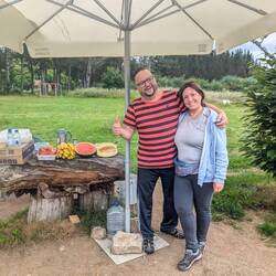 We did find one more special spot today on our walk. A Spanish couple had set up an oasis next to the path about 13 kilometers out of Lugo. They had melons, bananas, coffee, water and chairs - all on a donation basis. There are some people who have figured out how to capitalize on the Camino with money making opportunities. There are other people, usually people who have been pilgrims themselves, that give back to the Camino and serve those walking now. David and his wife are two of those people and Bonnie and I were grateful to receive from them as well as donate to their oasis as we left.