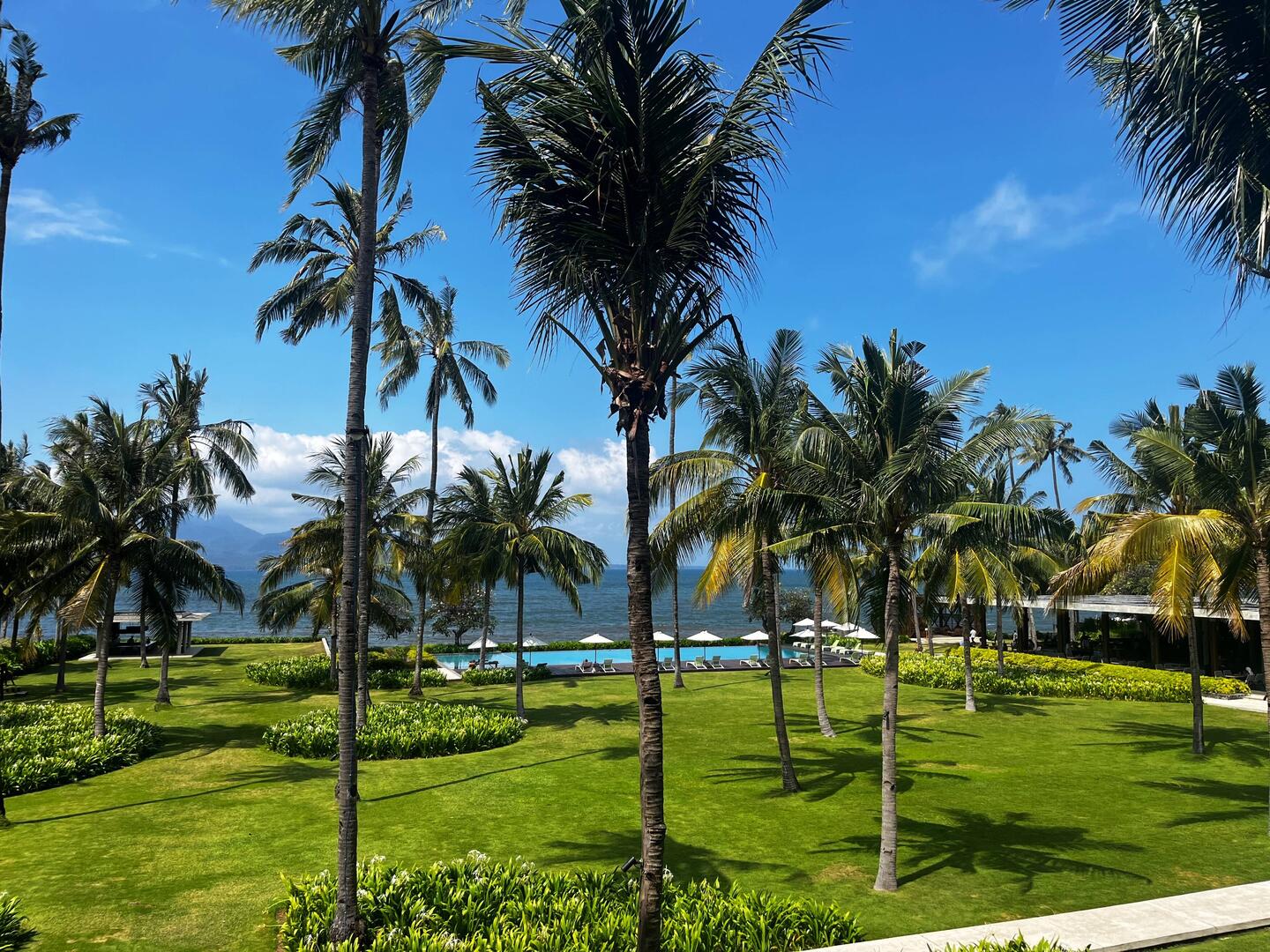 Oben angekommen, bot sich ein unglaublicher Ausblick: Rundherum dichte grüne Hügel, Palmen und Vulkane in der Ferne. Zwischen den Stupas, den glockenförmigen Steinbauten, saßen die Buddha-Statuen.
