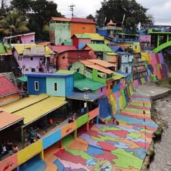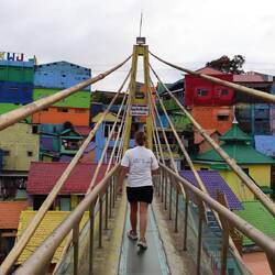 Über 100 Häuser am Fluss „Brantas“ wurden in kräftigen Farben bemalt, um das sehr verarmte Viertel aufzuwerten und Touristen anzulocken. Die Bewohner verdienen heute mit kleinen Shops, Streetfood-Ständen und Souvenirverkäufen ihren Lebensunterhalt – ein Beispiel für Community-Tourismus mit sozialer Wirkung. Doch die andere Seite ist auch, dass die Armut weiterhin überall zu sehen ist. So nett es ist die teilweise sehr runtergekommenen Häuser bunt anzumalen, so sehr sieht man auch in allen Ecken Müll und Kinder, die daraus Spielzeug basteln. Wir sehen Szenen, die uns nachdenklich stimmen und auch wenn wir in die Kamera lächeln, fühlt es sich auch oft falsch an. Die zwei Seiten eines eigentlich so liebevoll gemeinten Projektes.