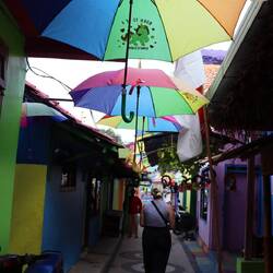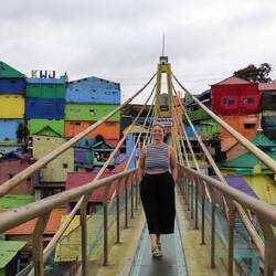 Nachdem wir noch ein paar Stunden in unserem Hostel schliefen, erkundeten wir die Stadt. Besonders beeindruckend in vielen Hinsichten war für uns das „Rainbow Village“. Dieses 2016 von Studenten der Universität Malangs initiierte soziale Projekt liegt nur wenige Schritte vom Stadtzentrum entfernt und gilt als eines der wohl farbenfrohesten Viertel Indonesiens. Der richtige Name des Viertels ist „Kampung Warna-Warni Jodipan“.