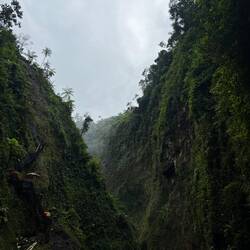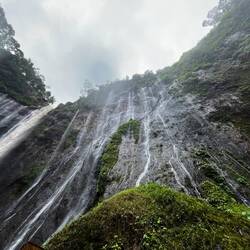 Heute erwartete uns eine absolute Highlight-Tour. Während die Wackinger gerade das Wacken Open Air 2025 unsicher machen (danke, dass ihr mich so schön aus der Ferne daran teilhaben lasst 😬🤘🏻) ging es für uns früh morgens knapp 2,5 Stunden mit dem Auto in das kleine Dorf Sidomulyo. Nach der Ankunft wurde unserer kleinen Zufalls-Gruppe, bestehend aus 5 Personen (ein südafrikanisches Pärchen, eine Griechin + wir) am Eingang ein Guide zugewiesen. Nun ging es knapp 1 Stunde bergabwärts – über Stock und Stein, Bambusleitern und vielen kleinen Wasserfällen hangelten wir uns am Abstieg entlang. Ein absolutes Abenteuer und nichts für schwache Nerven. 😅 Und dann waren wir endlich angekommen – am Fuß des „Tumpak Sewu“ Waterfall (übersetzt: „tausend Wasserfälle“). Dieser Ort sieht aus, als wäre er aus einem Fantasyfilm entsprungen. Hunderte feine Wasserströme stürzen in einem halbkreisförmigen Kessel rund 120 Meter in die Tiefe – umgeben von dichtem Dschungel und mit dem großen Vulkan „Semeru“ im Hintergrund. Bis dahin fühlte es sich bereits an als hätten wir geduscht. Dank unserer geliebten North Face Regenjacken (unbezahlte Werbung 🤪) alles kein Problem. 😎