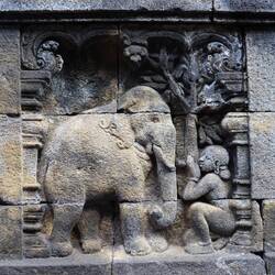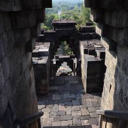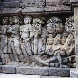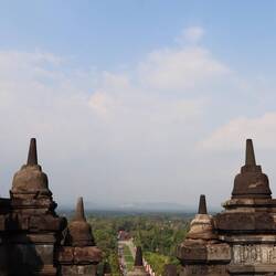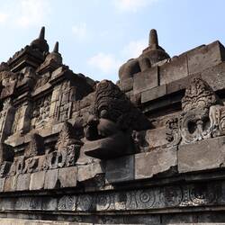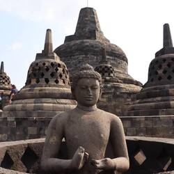 Der Borobudur ist aufgebaut wie eine riesige Pyramide, die sich spiralförmig nach oben windet. Auf einer Fläche von 2.500 m² erzählen auf jeder Ebene 2.672 Reliefplatten und 504 Buddha-Statuen Szenen aus dem Leben Buddhas. Auf dem Weg durch die einzelnen Ebenen berichtete uns der Guide ganz viel Wissenswertes über den Tempel und den Buddhismus selbst.