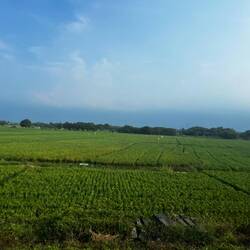 Mit dem Roller ging es knapp eine Stunde aus Yogyakarta raus, vorbei an grünen Reisfeldern, durch kleine Dörfer und im Hintergrund die Silhouette des Merapi-Vulkans. Wir kamen gegen Mittag an und die Sonne brannte ordentlich. 🥵