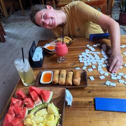 Unsere letzte Zugreise in Indonesien führte uns von Yogyakarta nach Jakarta – die Hauptstadt Indonesiens. Da uns wirklich jeder, selbst die Einheimischen gesagt haben, dass Jakarta keinen Besuch wert ist, haben wir uns dazu entschieden nur die Nacht hier zu verbringen, um dann morgen früh in das nächste Land auf unserer Liste zu fliegen. Gestern Abend fanden wir eine deutsche Bäckerei, die leider nur auf Vorbestellung produziert. 😫 Dafür weckte das Restaurant direkt daneben unser Interesse und bei einer echt leckeren Pizza und einer Runde Rummikub ließen wir unseren letzten Abend in Indonesien ausklingen. Nachdem unser Tisch zu klein war für das Spiel und unser Essen half uns die Kellnerin freundlicherweise und sammelte mit Xenia geduldig unsere Spiel-Steinchen ein, um an einen anderen Tisch zu ziehen. Die Szene war für alle Beteiligten recht lustig. 😅