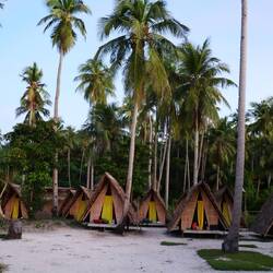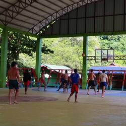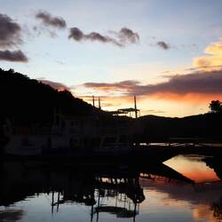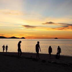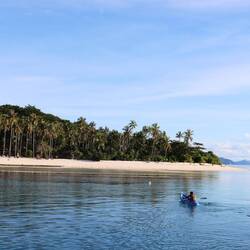 Der erste Tag ließ einiges davon wahr werden. Zu Beginn ging es direkt mehrfach ins kristallklare Wasser und wir erkundeten das Meer mit unseren Schnorchelmasken. Nach dem hervorragenden Mittagessen an Board wurden wir auf Kajaks gesetzt, die uns an Land brachten und wir schauten uns ein kleines Dorf auf der Insel Linapacan an. Ehrlich gesagt gefiel kaum jemandem von uns dieser Stopp. Als wir eine Schule besichtigten, fühlten wir uns sehr unwohl, weil man das Gefühl hatte ein „Eindringling“ zu sein. Wie Tiere im Zoo wurden die Kinder begafft und sie führten einen einstudierten Tanz auf – um der Touris Willen. Naja, mit gemischten Gefühlen verließen wir das Gelände und wurden auf einen Basketballplatz gebracht. Hier spielten einige Männer unserer Gruppe mit der Crew. Alle anderen saßen drumherum und wussten nicht so richtig, was dieser einstudiert wirkende Stopp tatsächlich sollte. Gern hätten wir mehr von dem Dorf oder dem Leben der Menschen hier gesehen, aber die leeren und eher trostlosen Gassen ließen uns mit vielen Fragen zurück. Eine Stunde später wurden wir wieder mit den Kajaks zum Boot gebracht und fuhren weiter. Eigentlich sollten wir nach jedem Schnorchelstopp auch auf einer kleinen Insel abgeladen werden – leider wurde dies vom Crew-Chef immer wieder zurückgenommen, aufgrund verschiedener Gegebenheiten (Wasser zu flach, Quallen oder manchmal auch einfach ohne Begründung). Insgesamt wussten wir ehrlich gesagt alle nicht so richtig, was am Tag passiert. Keine Erklärung, keine Vorbereitungszeit. Plötzlich stoppten wir und es ging rein ins Wasser und fast so schnell auch wieder raus und weiter – so verlief der gesamte Tag und wir fragten uns, ob wir eine ausschließliche Schnorcheltour gebucht hatten – die „paradiesischen Strände“ haben wir leider nur aus großer Distanz gesehen. Am späten Nachmittag kamen wir dann auf einer kleinen vermeintlich unbewohnten Insel an und bezogen unsere Hütten. Der Sonnenuntergang war unfassbar schön und wir genossen die Zeit am Strand.