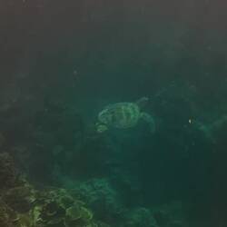 Auf der Insel Kelor angekommen, erwartete uns wieder ein kleiner Aufstieg – dafür war das heute schon eher Klettern als Wandern und wir waren sehr dankbar für den einen oder anderen helfenden Arm als wir uns an den Klippen hochzogen. 🫣 Am Ende wurden wir mit einer wunderschönen Aussicht belohnt und nach einem kleinen Fotoshooting später, ging es dann auch schon wieder hinab. Nun wartete ein weiteres Highlight auf uns – wenn man hier ins Wasser geht, trifft man zu 99% auf kleine Haie. Zugegeben, sie waren wirklich klein und haben mein Bedürfnis nach „Einmal im Leben mit Haien schwimmen“ noch nicht ganz befriedigt. Trotzdem war es ein total schönes Erlebnis und auch ein bisschen aufregend. 😍 🦈 Nach diesem kleinen Abenteuer ging es für uns nochmal auf dem offenen Meer ins kühle Nass und neben wunderschönen Riffen und bunten Fischen, sah ich die größte Meeresschildkröte bisher auf unserer Reise. Ich habe keine Ahnung wie groß sie war, aber ich hätte sie wohl noch ewig fasziniert beobachten können. 🤩 Da sie in der Tiefe am Meeresboden lag, war es leider zu dunkel für Aufnahmen, aber die Erinnerung zählt. ☺️