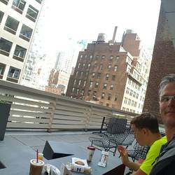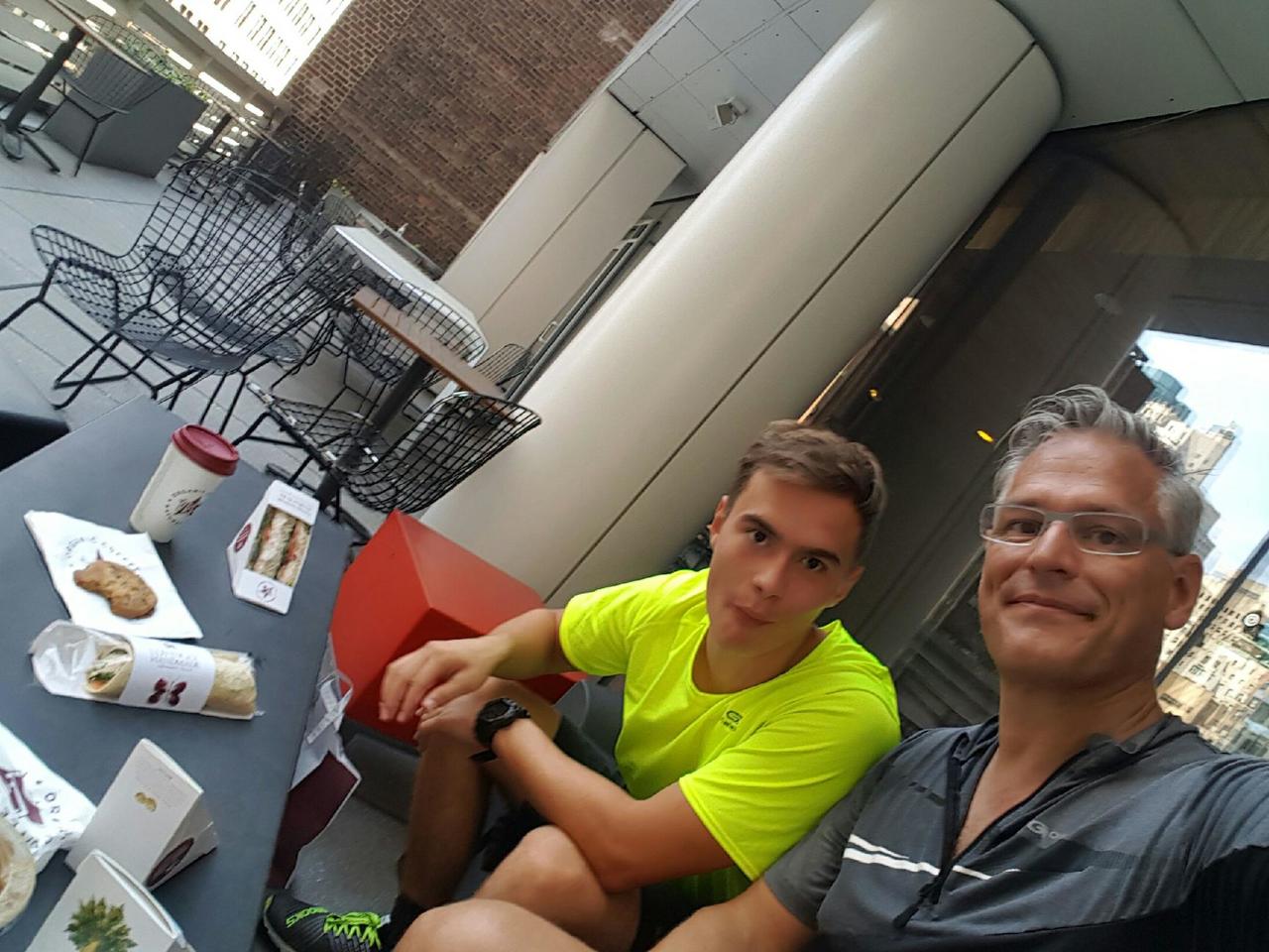 Nach dem Lauf, neben dem Hotel bei "Prêt à manger" sandwich, Kaffee, croissants, und Saft geholt und auf der kleine Terrasse des Hotels und 10. Etage gefrühstückt.