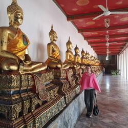 Der berühmte liegende Buddha findet sich im Wat Pho Tempel. Die Halle um den Riesen ist kaum größer als er selbst und es sind einfach überall Menschen. Man wird fast durch die Anlagen geschoben. Erst kurz vor Schließung wurde es leerer und wir konnten uns noch einmal in Ruhe umsehen. Die eigentliche Tempelanlage ist ziemlich groß und beeindruckend gestaltet, auch wenn nur der liegende Buddha bekannt ist. Es gibt darin etliche Chedis im unterschiedlichen Größen. Diese sind Mahnmale, welche verschiedene Funktionen für Buddha haben können.