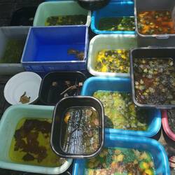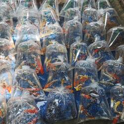 Mit einem Iced Coffee", ging es zum Catuchak weekend Markt, dem größten Markt Thailands. Mit dem Bus ist man echt recht schnell und super günstig dort. Wir bräuchten eigentlich beide noch ein paar kurze Hosen und sind daher zuerst in den Kleidungspart. Preise waren echt in Ordnung. Ca 6-7 Euro, aber "no try" hat uns dann doch etwas abgeschreckt. Im Anschluss findet sich der Künstlermarkt mit außergewöhnlichen Stücken. Bilder, Skulpturen, etc in jedem Stil. Danach kamen wir am Lebendtiermarkt an. Dieser fängt erst "harmlos" mit Fischen an, welche zu hunderten eng gequetscht in Aquarien zusammen gepfercht oder in Plastiktüten auf der Straße ausgestellt werden. Fische jeder Art, auch die japanischen Kampffische oder Kois werden hier im wahrsten Sinne des Wortes verschleudert. Hummer, Krabben, exotische Frösche, Axolotl... Die Hälfte davon hatten wir noch nie gesehen. Auf den Bildern kommt die Masse und die "Auslage" gar nicht richtig zur Geltung.