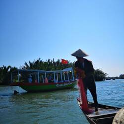 Ein weitere Attraktion in Hoi An sind die Kokosnussboote. Mit dem Fahrrad war es ein gutes Stück zu den Booten, aber es hat sich gelohnt. In einer großen Schale fährt man ca. 50 Minuten mit einem Ruderer über den Fluss. Eine ziemlich lustige Sache. Aus Palmenzweigen haben wir Grillen und einen Haarreif bekommen, im Anschluss folgt ein wenig Touristenprogramm. Jemand "tanzt" in bzw. mit den Booten und man bekommt aus der Nähe Fischfangen mit einem Netz gezeigt. Ziemlich interessant 😊