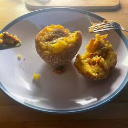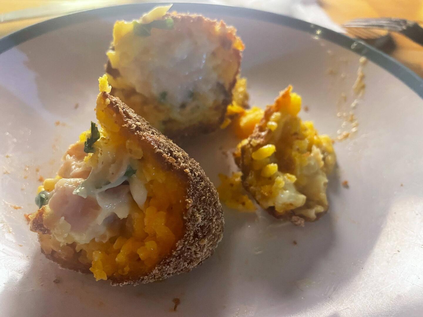 Gestern gab’s die wohl bekannteste Spezialität Siziliens: „Arancino“ = gefüllte Reisbällchen, schön aus der Fritteuse … sehr knusprig und lecker: